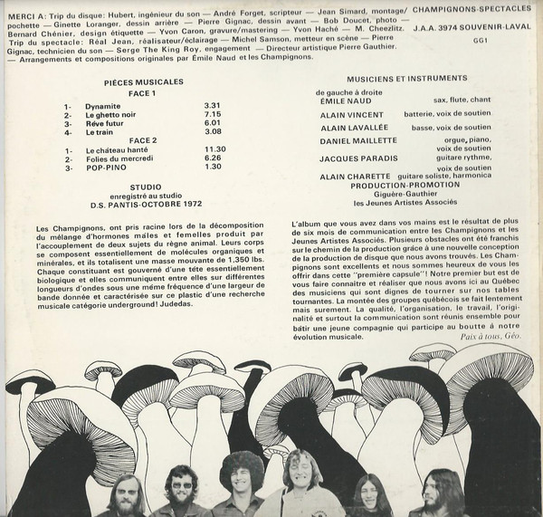 Musicalement, Champignons donnent dans le Blues Rock fortement acidifié, avec de savoureux relents de prog-rock, d’la guitare fuzz comme on l’aime, du sax crimsonien, de la flûte éthérée et des passages d’orgue électrique éblouissants. Dès les premières notes de la pièce d’intro, l’instrumentale « Dynamite », on sent un groupe de jeunes musiciens totalement investis dans leur art. Ce morceau est une mise en bouche d’une grande qualité, qui confirme qu’on a affaire ici à un très grand disque. Mention spéciale au très sympathique solo de batterie au centre de la piste… S’ensuit la très bluesy « Le ghetto noir » qui est portée par l’orgue nonchalant et l’harmonica. Malgré les vocaux très québécois, on respire des arômes de la Nouvelle-Orléans !